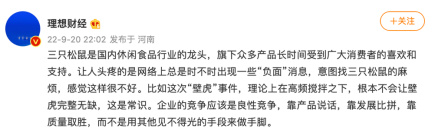 9月20日,三只松鼠官微称已经向公安部门报警,主动配合市场监管部门调查。